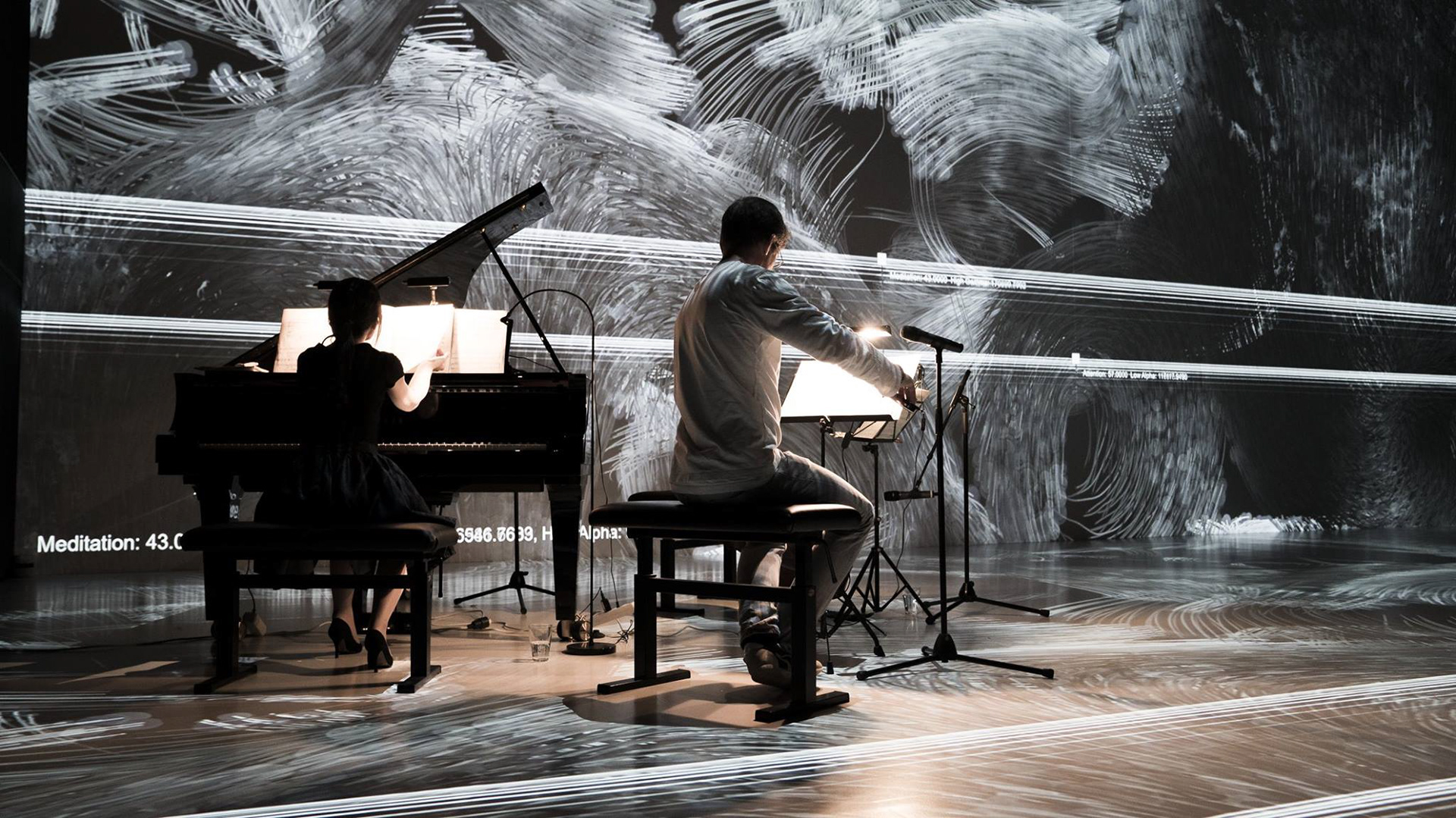 Ouchhh created a cognitive performance that we generated real-time brain waves at the Deep Space with the South Korean/German trio. At a concert which we visualized the changes in brain wave activities in real-time, we transformed the Delta, Theta, Alpha, Beta and Gamma brain waves into a real-time concert experience that is wrapped around by generating the data about emotion, focus & attention, some auditory and neural mechanisms with electroencephalogram (EEG).